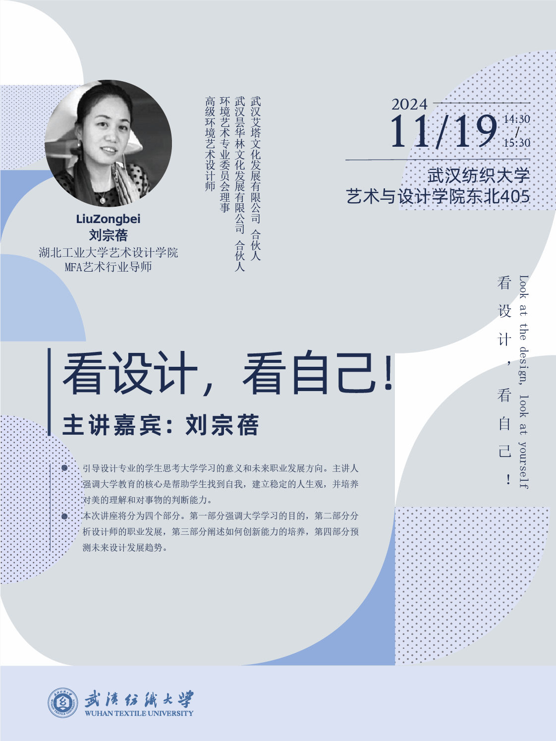 在学院东北405教室举行“启迪设计思维与职业发展之路”专题讲座,本次讲座由武汉昙华林文化发展有限公司总经理刘宗蓓女士进行主讲。讲座聚焦大学学习目的、设计师职业发展、创新能力培养及未来设计趋势四大板块,学院公共艺术专业二年级和三年级的学子们深度剖析行业内涵,指引未来发展方向。