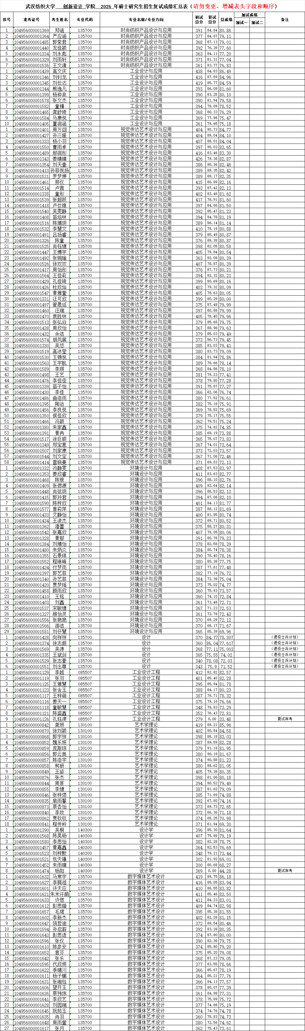 武汉纺织大学创新设计学院2026硕士研究生复试成绩公示(一志愿)