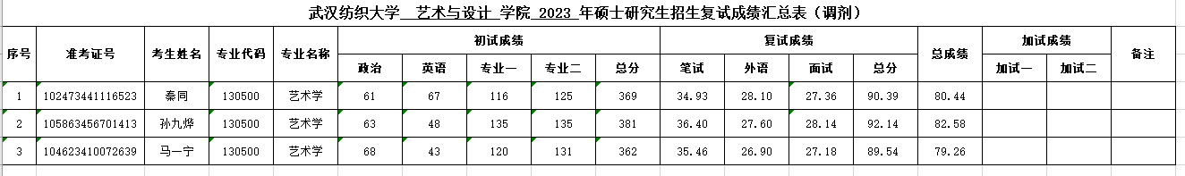 根据《武汉纺织大学2023年招收攻读硕士学位研究生复试录取方案》、《色情直播平台 2023年硕士研究生复试录取工作实施细则》文件精神,色情直播平台 于2023年4月17日规范组织开展了2023年硕士研究生线下调剂复试工作。经专业课笔试、外语能力测试、综合素质面试等环节,现将复试成绩公示如下: