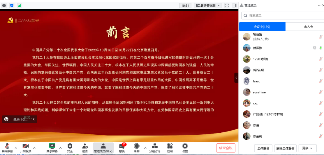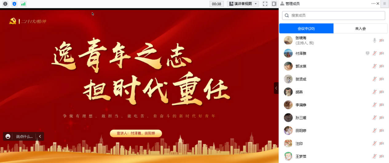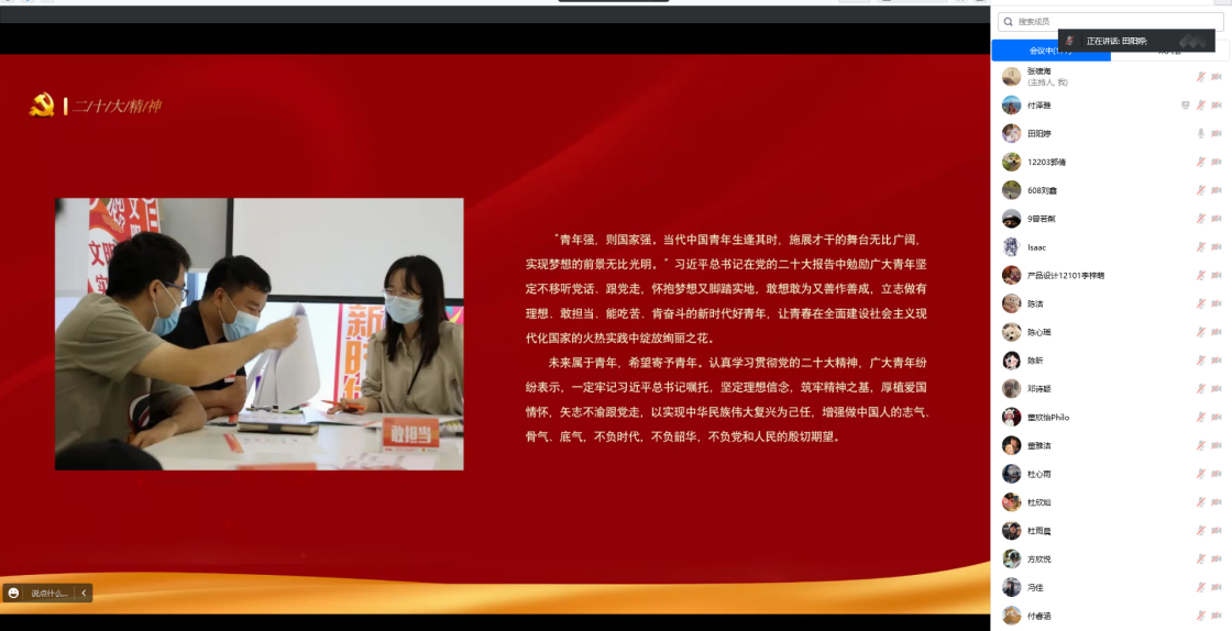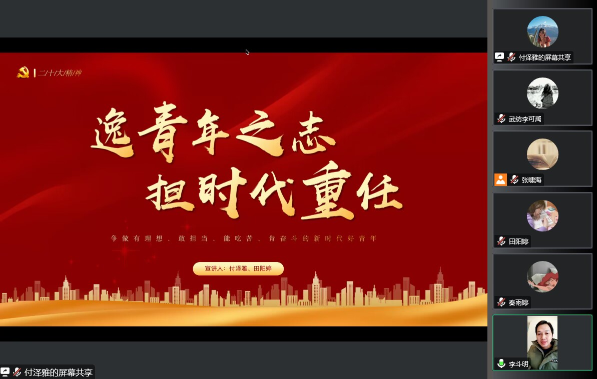 为引导同学们深入学习党的二十大精神,艺术学院和伯明翰学院于1月10日下午联合开展了“学习党的二十大精神”宣讲活动,此次宣讲以“逸青年之志 担时代重任”为主题,生动诠释了青年在新时代要求下的担当和责任。伯明翰学院党委副书记李斗明线上参会,艺术学院辅导员张啸海主持会议,艺术学院、伯明翰学院学生于线上线上同步参会。