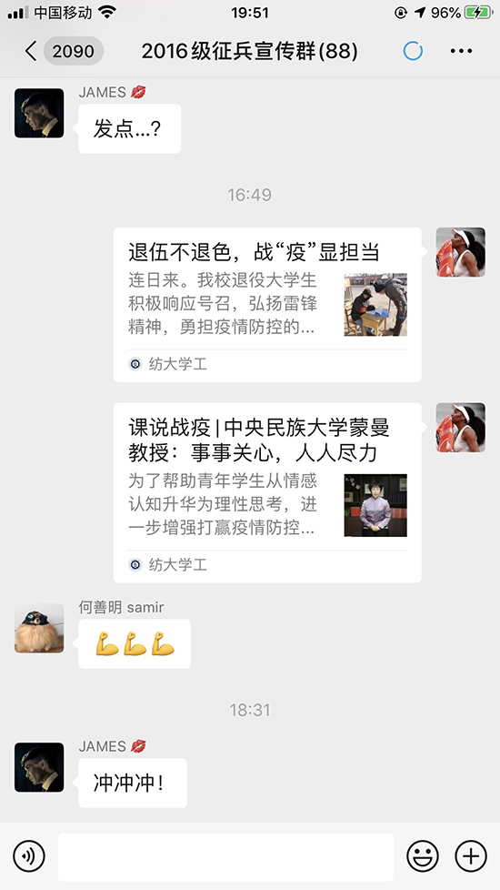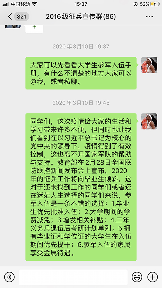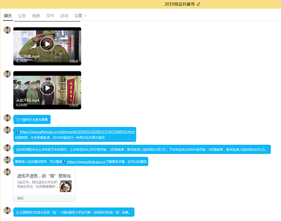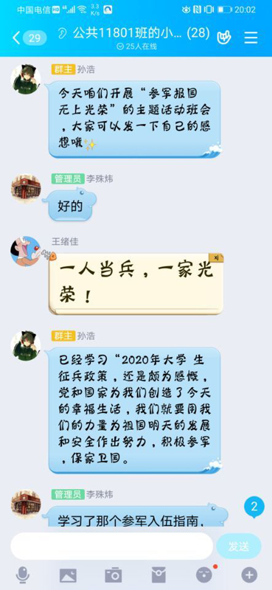 此次网络征兵宣传班会,由各年级辅导员主持,通过网络主题班会的形式向同学们详细传达了学校关于征兵宣传的相关文件要求,并对2020年度征兵工作就时间节点、政策支持、优惠奖励、注意事项等多方面进行了具体说明;强调了应征入伍的意义,这是新形势下提高部队兵员素质、加强国防和军队现代化建设的重大举措;国家为大学生应征入伍提供机会,也是当代大学生难得的机遇,有利于丰富大学生个人经历。