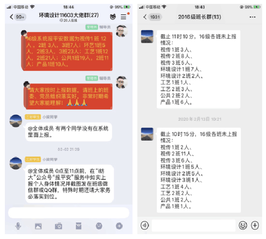 学院全体学工队伍,认真落实学校工作要求,践行使命担当,扎实奋战在疫情防控最前线。每日24小时保持电话畅通,通过网络、电话沟通与学生“心连心”,密切掌握学生健康、思想动态。构建网上家校联络平台,筑牢家校协同育人机制。通过网上主题班会等多形式,“面对面”进行宣传教育,“点对点”给予支持帮助,增强学生的思想认同、防护意识和必胜信心,全力以赴做好疫情防控工作,守护学生健康平安。