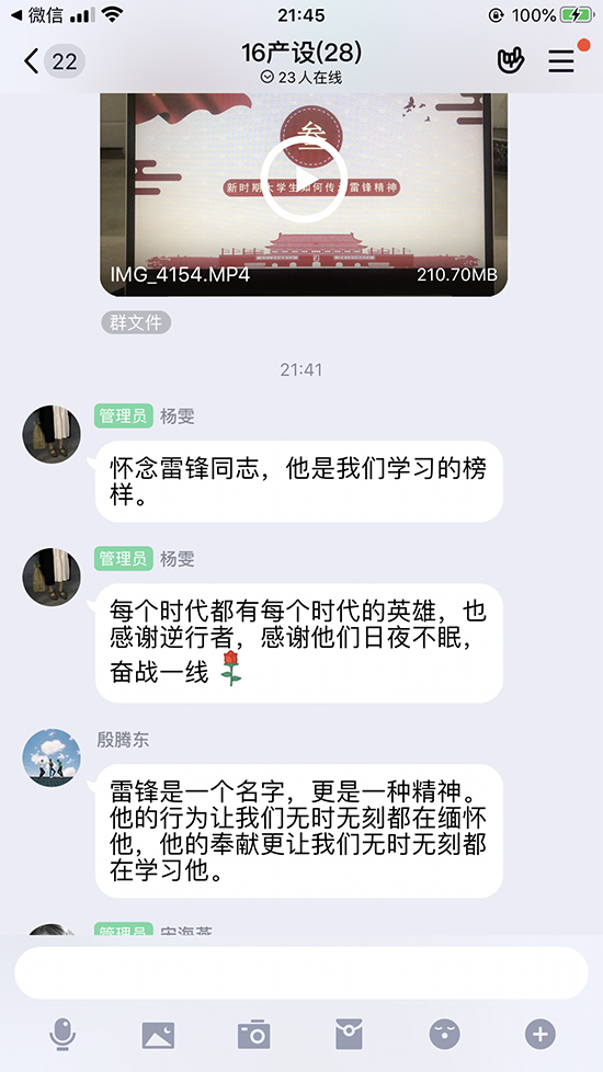 本次班会主题是“传承新时代雷锋精神”,由年级辅导员张舟老师录制网络班会视频,同步学习;张舟老师从新时期雷锋精神说起,结合近期抗击疫情中涌现出来的英雄人物事迹以及志愿者事迹诠释新时期雷锋精神,又以战斗在一线的师生代表为案例告知学生新时期如何传承雷锋精神。