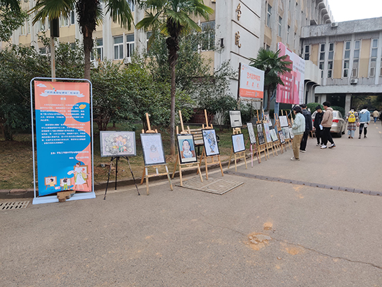 路过绘画展的师生被绘画内容吸引,纷纷驻足观赏。他们或为作品中展现的鳏寡孤独而黯然神伤,或为美好爱情而心神向往,亦或是为追逐梦想而热血沸腾。
