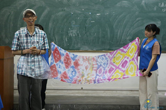 本次课程的亮点是志愿者们热情邀请了扎染专家胡思斌老师教授现场的家长和志愿者们扎染课程。 胡老师首先展示传统扎染艺术的作品及他自己设计的作品,看着一幅幅或古色古香、或绚丽夺目的作品是,大家都为中国传统的工艺美术赞叹不已,感慨扎染的魅力!紧接着,在场的家长志愿者和小朋友们聚精会神地听着胡老师细致讲解扎染的方法,并自己动手尝试起来,大家看着自己第一次做的作品,都开心不已,纷纷表示,以后要不断研究,扎染出更生动的艺术品出来。