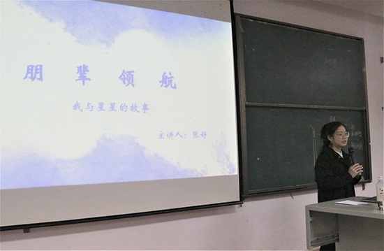“世界上有这样一群人,不愿与外界交流,就像天上的星星般孤独。而他们,就是努力将这些来自星星的孩子拉进自己温暖怀抱的人。他们热情,像初生的朝阳,驱散夜的冰凉。只为付出,不求回报。这是他们的信念,是他们的坚守。他们就是蓝灯志愿团,是自闭症儿童的守护天使!”11月26日晚7点,南湖校区尚美楼T101座无虚席,鸦雀无声,艺术学院朋辈领航报告会,来自学院工艺11601班团支书、武汉纺织大学蓝灯志愿团团长张好为新生们分享了她与星星的故事。