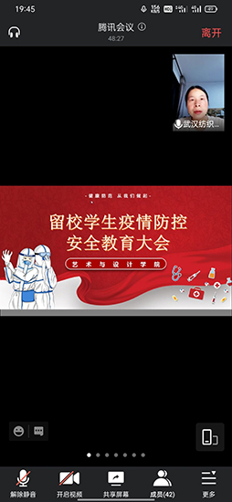 8月8日晚上7点,,艺术学院辅导员漆晚霞老师召集全体43名留校同学举行了“艺术学院2021年疫情防控暨安全教育工作专题会”,会上,漆老师首先对所有留校同学在前期克服炎热天气、学业压力,专心学习的行为给与充分肯定,接着,她给大家通报了目前全国疫情多点爆发的艰难形势与后期面临的严峻考验,传达了湖北省、武汉市、学校关于疫情防控的相关会议、文件精神,对于疫情防控状态下的学生教育管理工作做了明确要求,她强调,所有留校同学务必坚持校外同学一样,坚持每天报平安,未经老师允许坚决不出校门,如果前期有外出行为,一定要向老师如实汇报自己的行程行踪,另外,留校同学在校园内部依然要加强疫情防控的科学做法,比如尽量减少多人聚集、戴口罩、勤洗手、寝室多通风,科学作息、健康饮食等;第三,所有留校学生务必准守学校宿舍管理规定,不使用违规电器,不乱搭 电线,提高人身财产安全意识;第四,她鼓励同学们,利用暑期的时间认真备考,查漏补缺,为自己的青春留下浓重的一笔。最后,漆老 师针对当前疫情困扰、学业压力,为所有留校同学进行了一个简要的 特殊时期心理健康疏导,引导同学们正确辨别与认识心理亚健康的信号与应对方法,并将心理支持途径如校内外的心理援助热线公布给大家,鼓励同学们在特殊时期学会寻求帮助。