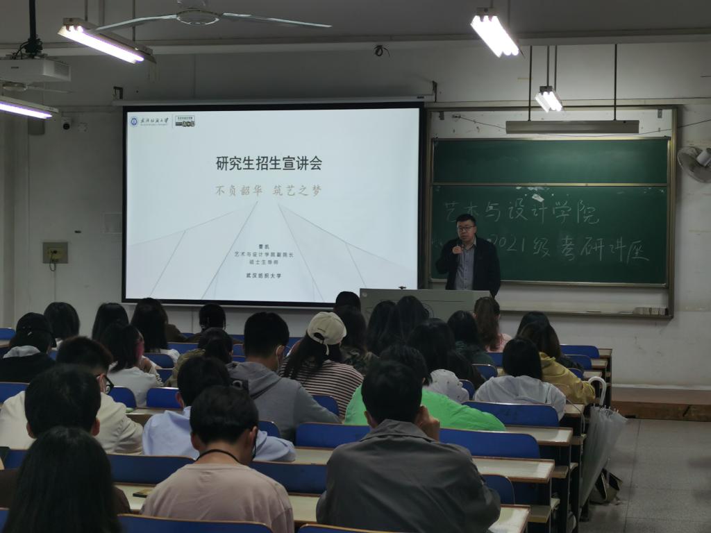 的历史文化、学院的研究生导师团队和代表性成果、学科与研究方向、研究生培养模式与目标、学院近年招生录取情况。随后,曹凯老师分别从专业、英语、政治三方面详细分析了考研的方法以及考研的内容等问题,并结合艺术生的实际情况讲解目标院校的抉择、书目的准备、学习的方法以及考试的技巧等。他认为学习效率、考研心态和自控力是决胜的关键所在,鼓励同学们要加强基础知识复习,提升学习效率,注重身体锻炼,多与老师们交流,积极寻找志同道合的研友,互相加油打气,共勉到底。