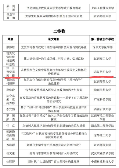 张舟老师和化工学院郭捷老师撰写的《在传承红色文化中厚植高校青年学生爱国主义情怀的价值研究》论文荣获二等奖。