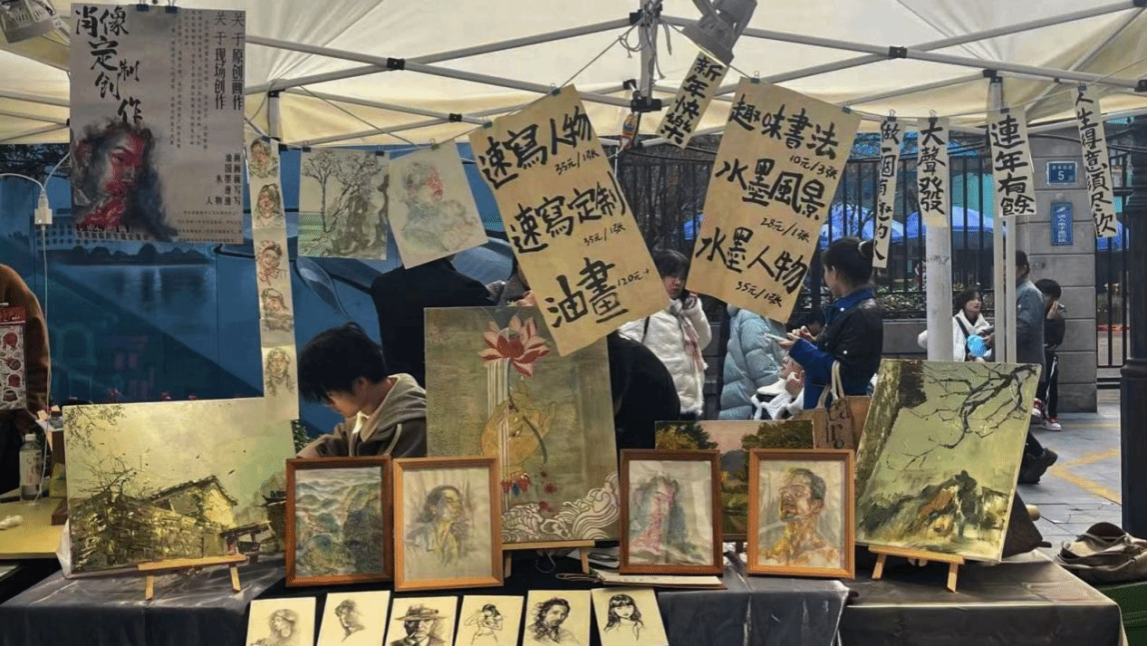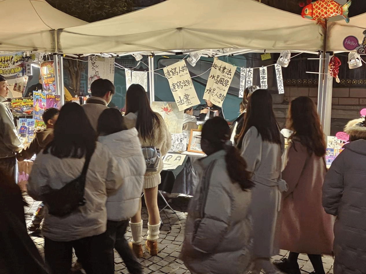 学生作品亮相热闹的黎黄陂路,同学们以创意集市形式面向广大市民,以学生课程作品展示、现场素描、题字等方式展现才艺。
