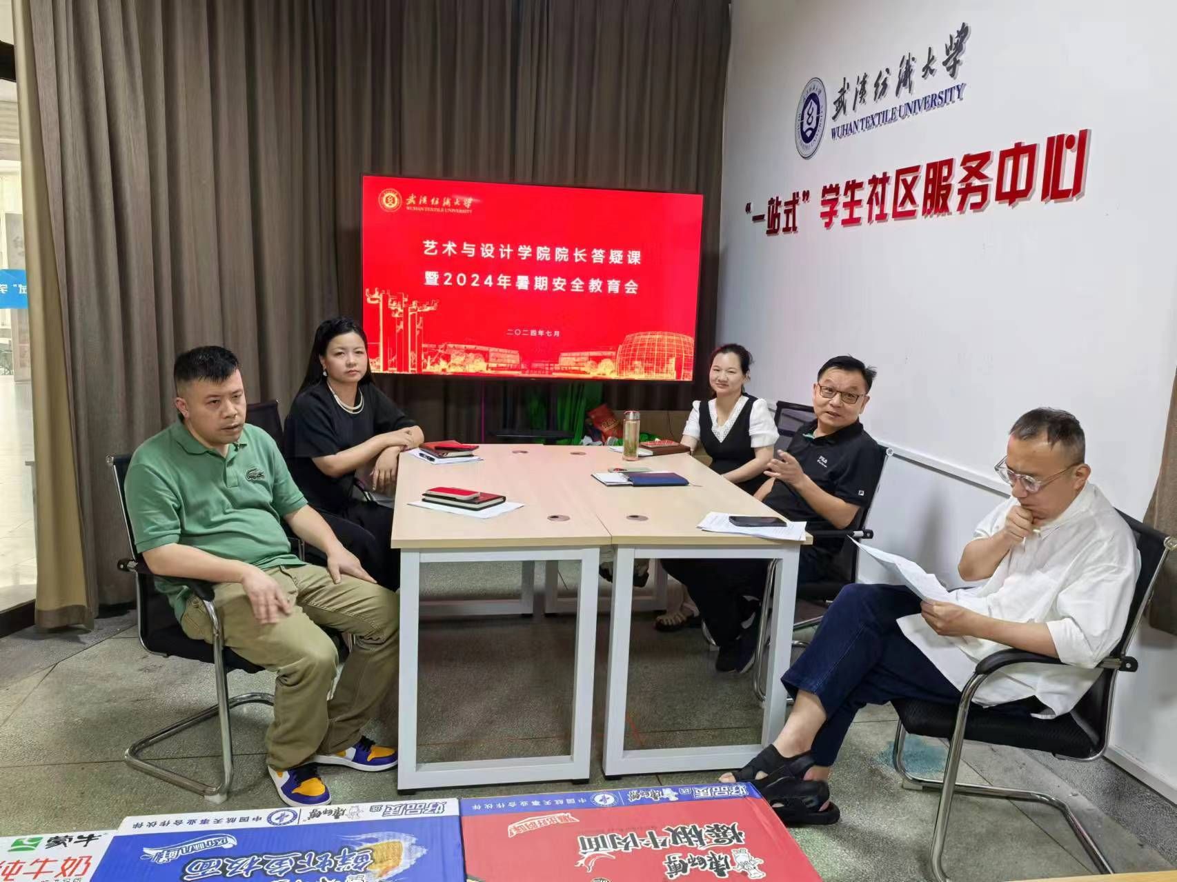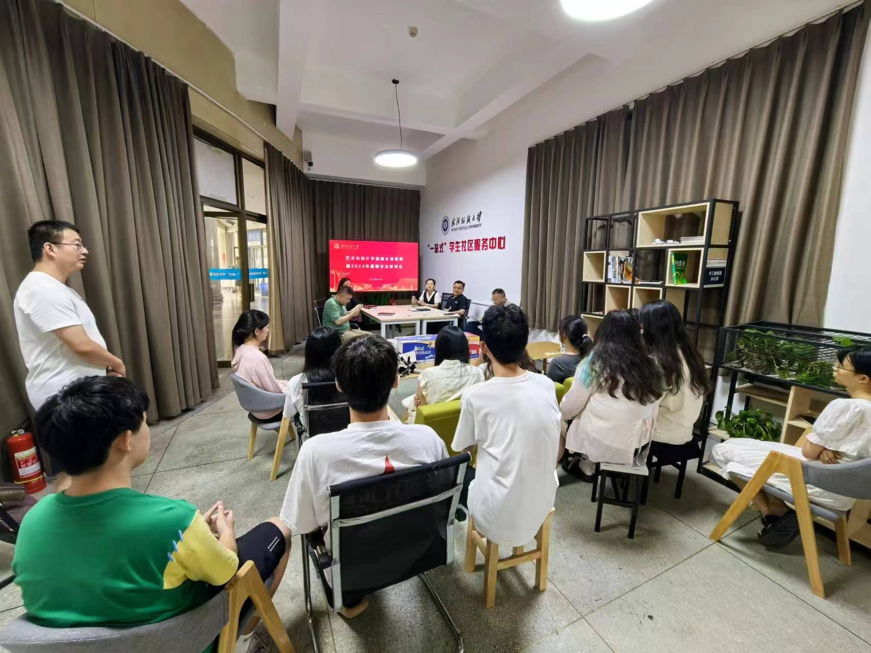 在南湖校区一站式学生服务社区举行院长答疑课暨暑期安全教育会议,学院党委书记刘元文、院长石元伍、副院长曹凯、副院长刘凡、党委副书记吴双、2021级本科生辅导员张啸海、留校考研学生代表参加座谈会。