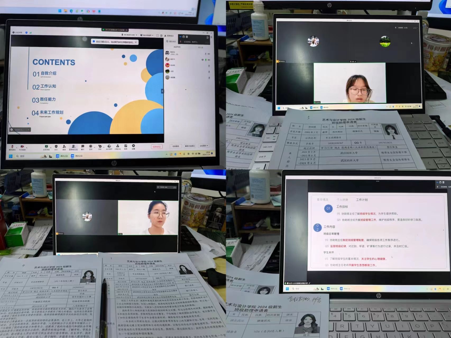通过线上形式举行2024级新生班助竞选,学院党委副书记吴双、团委书记陈畅、辅导员张啸海、熊潇潇、陈放担任评委,2024级新生辅导员韩泽光主持竞选仪式。