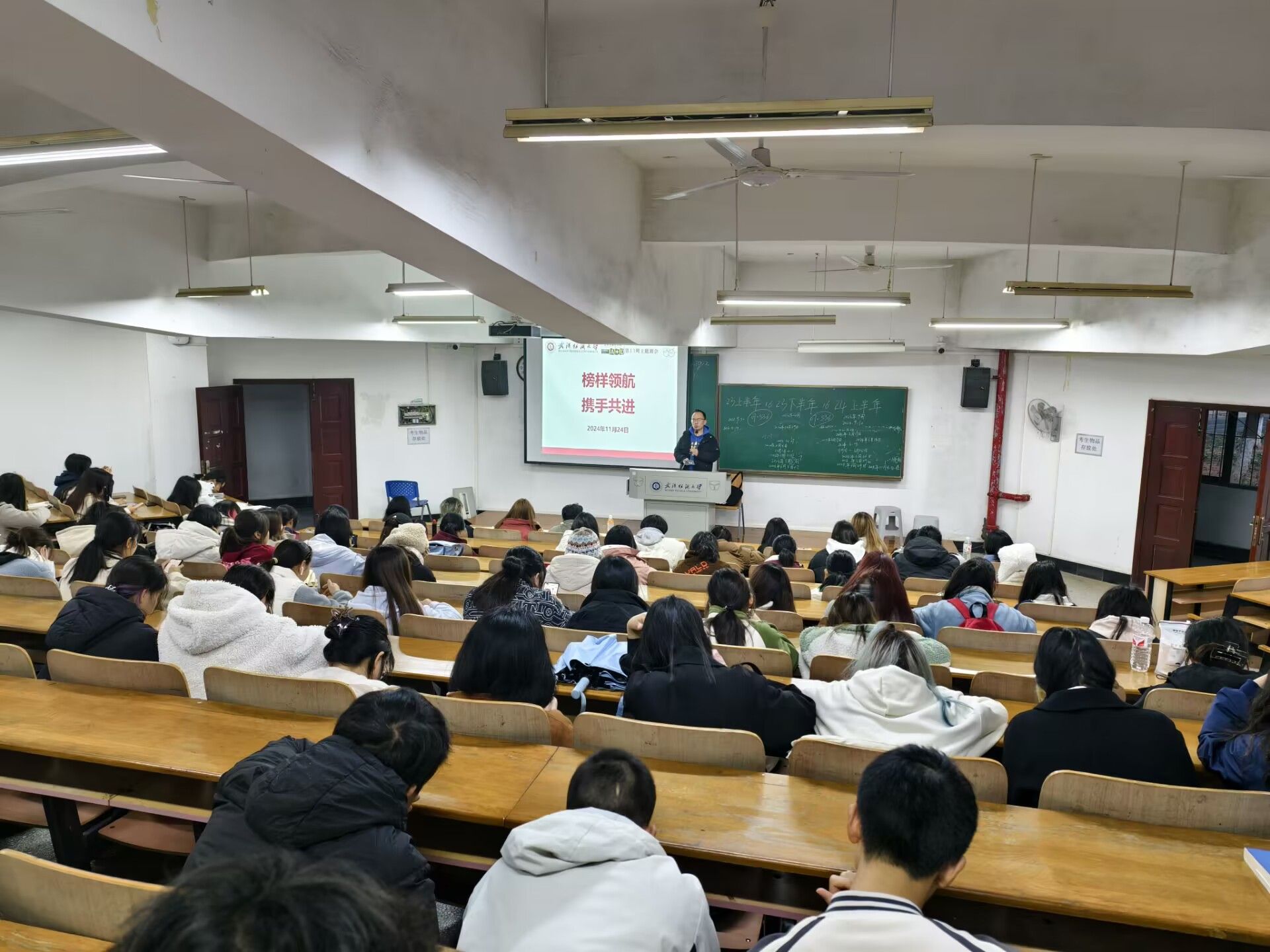 各年级各班召开“榜样领航 携手共进”主题班会,各年级辅导员、各班班主任主持班会,在校本科生参加本次会议。