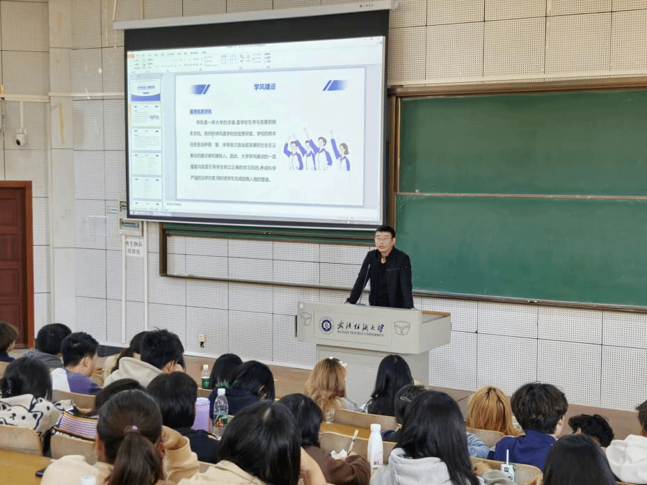 张啸海以《学生手册》为切入点,介绍了学校日常行为管理、学籍学业管理、评优评先等工作办法,强调了同学们遵守学校规章制度、养成良好学习习惯、积极追求进步的重要性,鼓励大家从大一开始明确目标,做好学习规划并付诸行动。