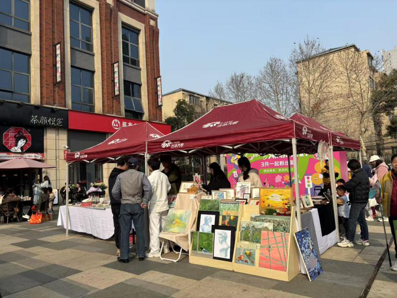 过程中,游客驻足工作室摊位,与同学们进行热烈的讨论、分享自己对于这些文化作品的独特见解。本次活动内容丰富多样,包括精工手作、时尚设计、绘画插画,无不展现了学生们创新精神。与集市中的其他创意摊位形成了良好的互动,共同营造了浓厚的文创氛围。