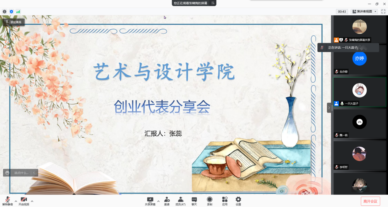 举办的大学生创新创业分享交流会在线上举行。主讲人为优秀创业生代表张蕊同学。